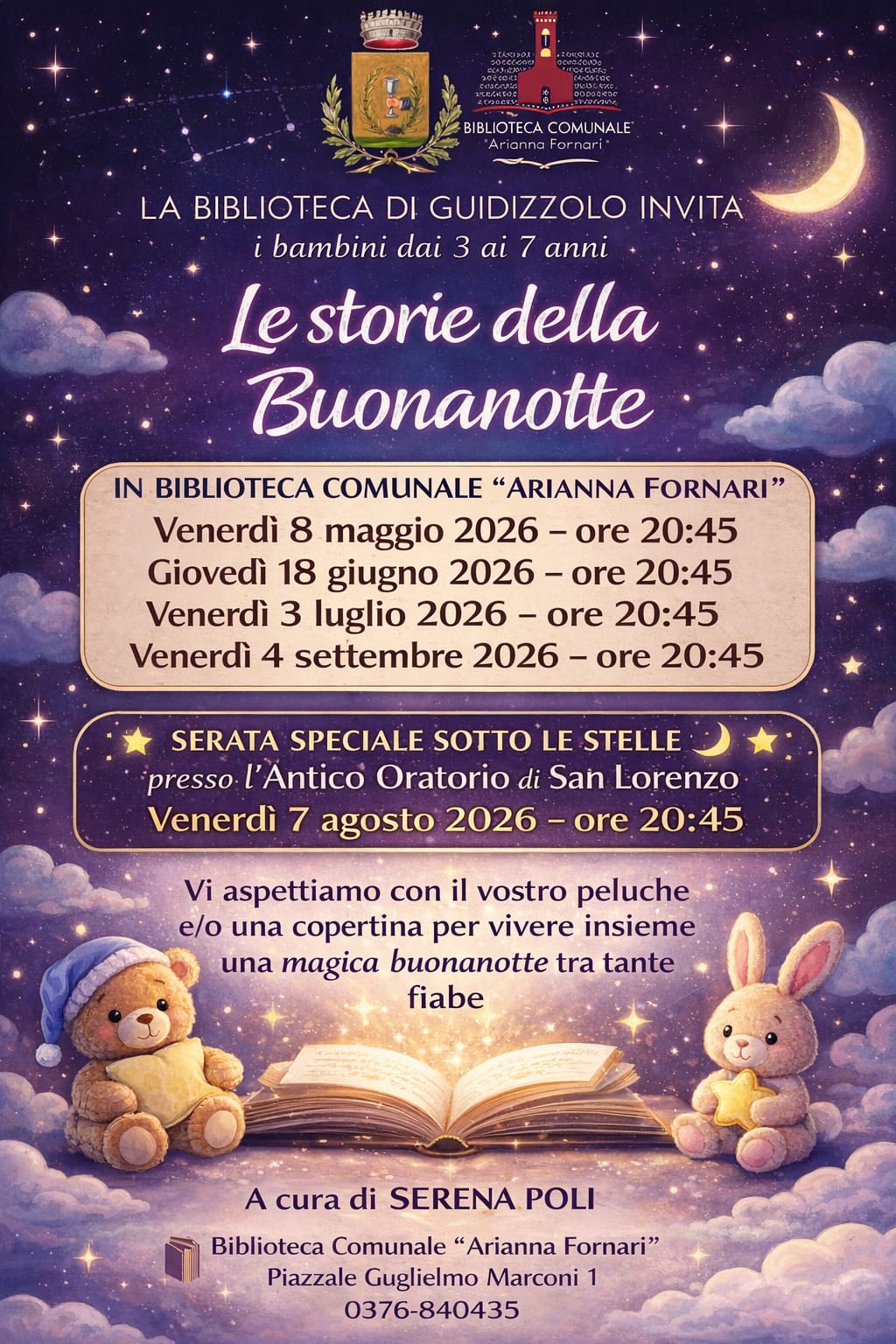 In Biblioteca arrivano “Le storie della buonanotte”, un momento serale dedicato ai più piccoli in cui ascoltare dolci fiabe in compagnia del peluche preferito; la lettura come coccola prima di dormire… per una serena notte.